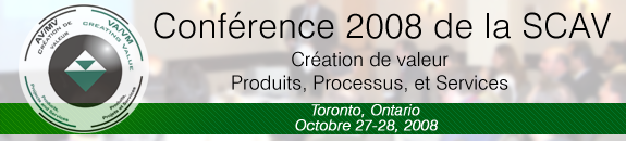 Cette annee, la societe canadienne d'analyse de la valeur tiendra sa conférence annuelle à Toronto/Markham, les 27 et 28 octobre 2008. Le sujet de la conférence sera comment l’analyse de la valeur/le management par la valeur est utilisé pour créer de la valeur dans les projets, produits et services.
